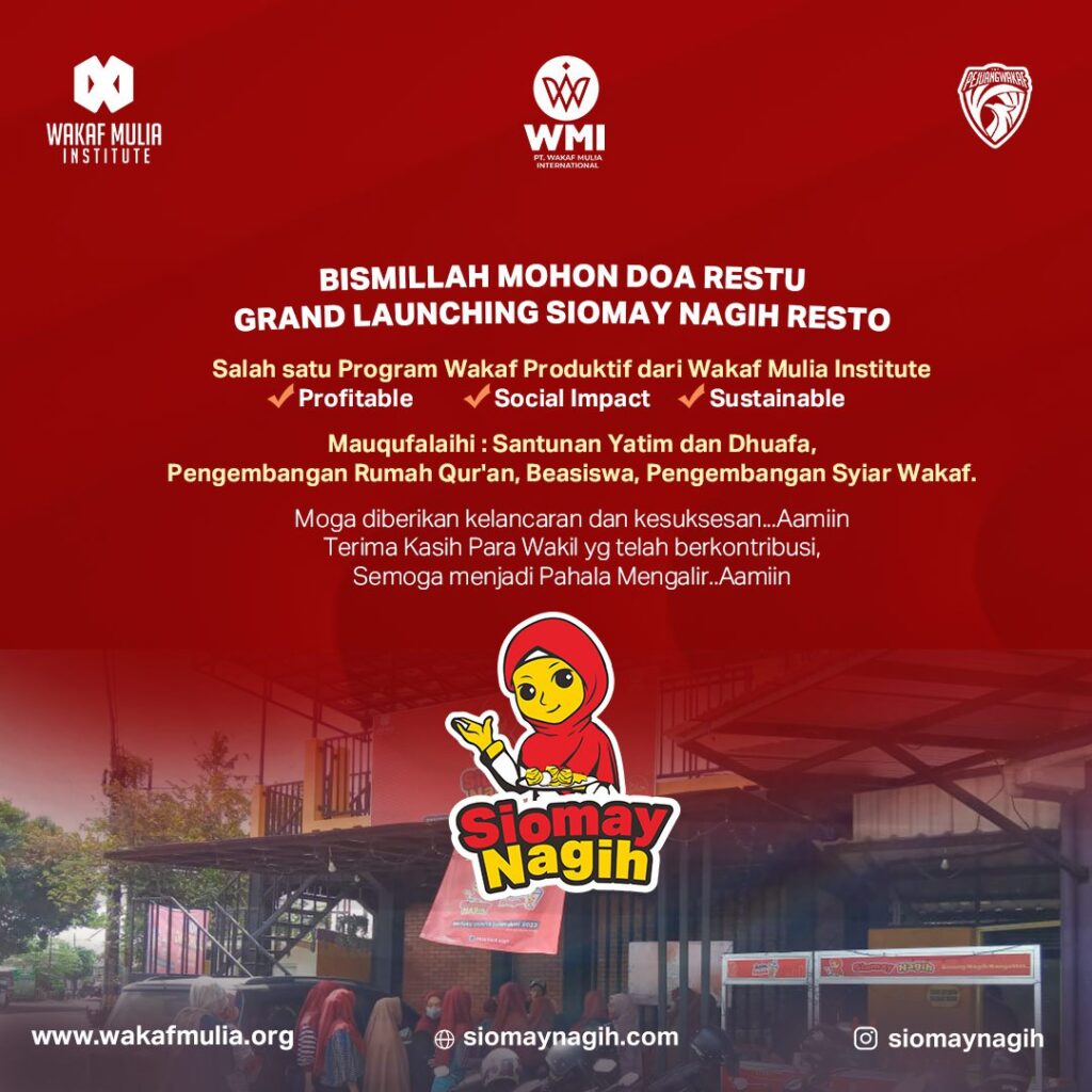 Bismillah Mohon Doa Restu Grand Launching Siomay Nagih Resto Salah satu Program Wakaf Produktif dari Wakaf Mulia Institute *Profitable *Social Impact *Sustainable Mauqufalaihi : Santunan Yatim dan Dhuafa, Pengembangan Rumah Qur’an, Beasiswa, Pengembangan Syiar Wakaf. Moga diberikan kelancaran dan kesuksesan…Aamiin Terima Kasih Para Wakil yg telah berkontribusi, Semoga menjadi Pahala Mengalir..Aamiin www.WakafMulia.org