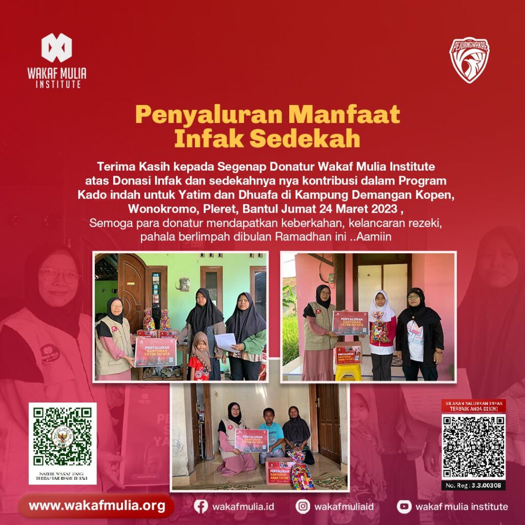 Terima Kasih kepada Segenap Donatur Wakaf Mulia Institute atas Donasi Infak dan sedekahnya nya kontribusi dalam Program Kado indah untuk Yatim dan Dhuafa di Kampung demangan kopen Wonokromo Pleret Bantul Jumat 24 Maret 2023 , Moga para donatur mendapatkan keberkahan, kelancaran rezeki, pahala berlimpah dibulan Ramadhan ini ..Aamiin